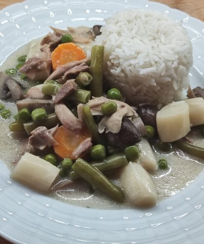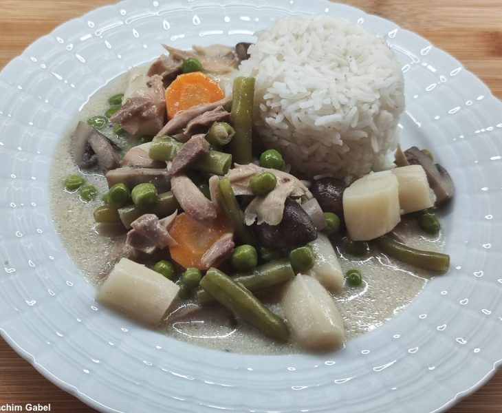 ↓Deutsch This is the chicken fricassee as it is cooked today, with meat from a soup hen or chicken and a colorful mixture of vegetables. …