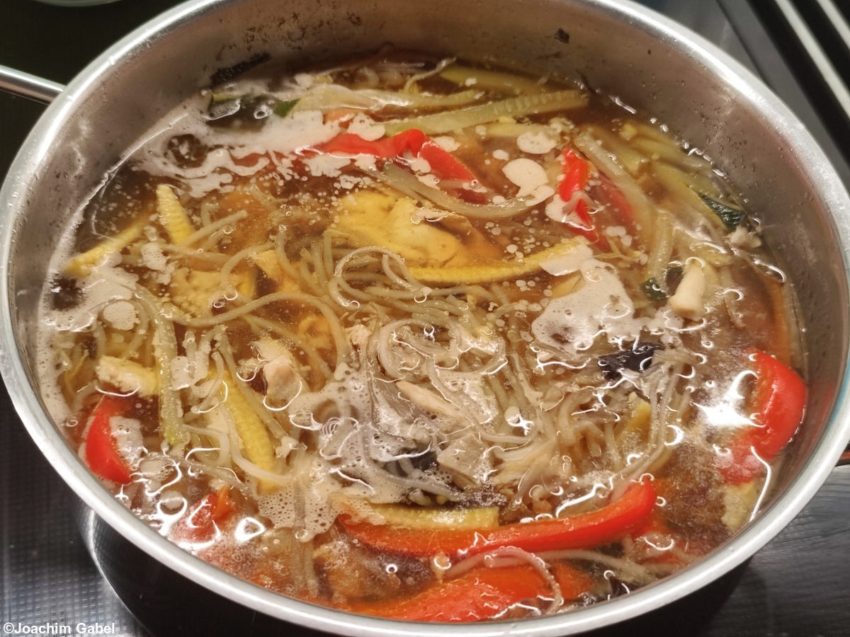 Diese Suppe ist eine Eigenkreation aus verschiedenen ostasiatischen Ländern wie Thailand, Indonesien, Vietnam und China. Da zumindest in den drei ersten Ländern relativ scharf gegessen wird, habe ich sie trotzdem gezielt neutral gelassen. Schärfe bekommt die Suppe erst am Tisch mit wahlweise Chilisaucen, frisch gehackten Chili oder Chiliflocken.