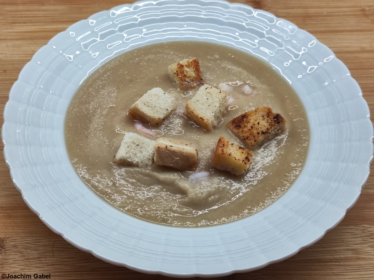 Das Ganze wird jetzt mit einem Stabmixer glatt püriert. Sahne, Pfeffer und Muskat zugeben, gut umrühren und abschmecken. Falls nötig, noch Gewürze und Salz nachwürzen.