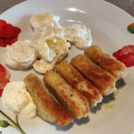 Die Beilagen auf diesem Bild sind eine Art Herzoginkartoffeln und ein Gurkensalat.