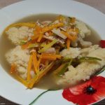 As described in the previous post, we have a lot of chicken stock and, inevitably, chicken meat. Half of a huge greens was overcooked to the taste of the broth, the other half came cut small in the chicken stew. In contrast to the original recipe, the chicken was about 3 kg and we had the half. Thus, there were 4 servings of chicken broth and half of the meat was being frozen.