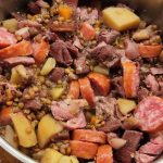 Als Fleischteile werden verschiedene Stücke bevorzugt. Ich nehme meist Schulter aber auch Schweinebauch, Teile der Keule oder vom Schweinerücken eignen sich eben so.