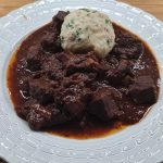 Danach für ein halbe Stunde in den Ofen ohne Hitze stellen. Die Soße in einen Topf geben, etwas entfetten und mit Wasser oder Bier auf einen halben Liter auffüllen. Zum Kochen bringen und mit 1 EL Mehl, in kaltem Wasser angerührt, zu einer Soße binden. Mit Salz und Pfeffer abschmecken.