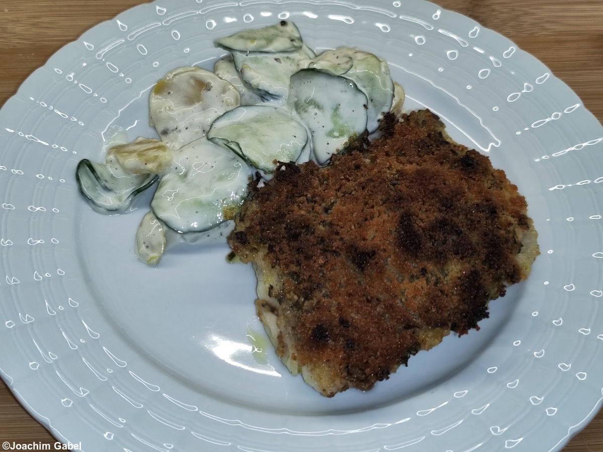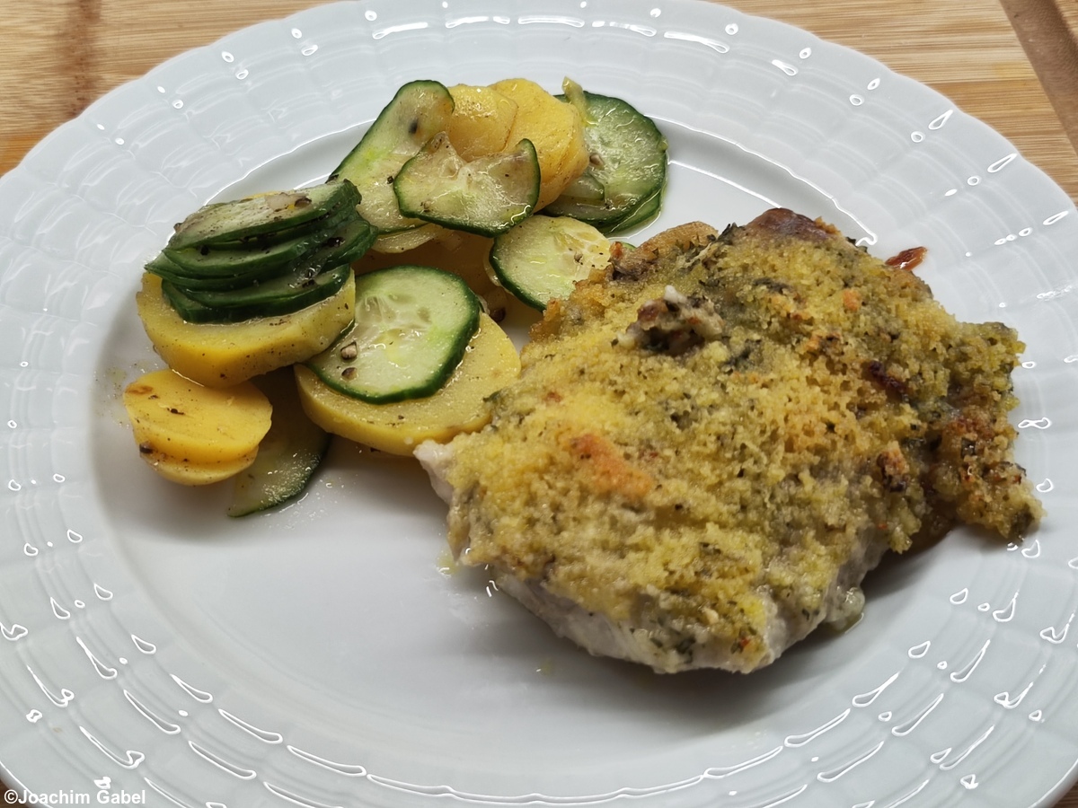 Dabei handelt es sich um ein Seelachsfilet, das mit einer Kruste aus Butter, Knoblauch, Kräutern und Semmelbröseln als Schutz überbacken wird.