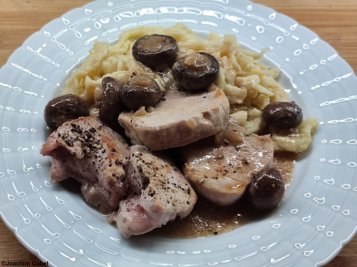 Finally, cream and sherry are poured in and the medallions are placed in the boiling sauce for 3 minutes and then eaten with potato croquettes, for example. Here in Swabia, however, Spaetzle are the most common side dish, especially when they are also hand-scraped.