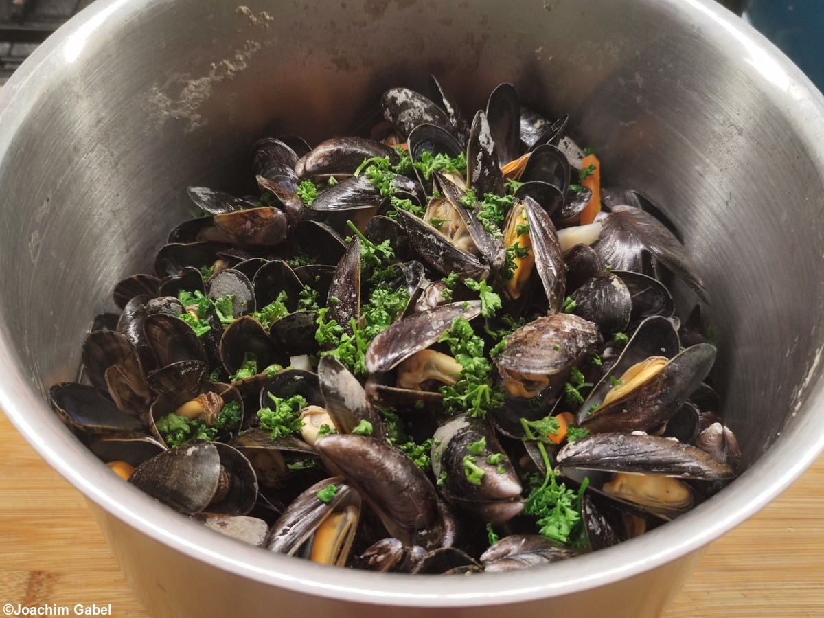Tip: Sew shells, which are open before cooking, several times. When they close, they are still fine. Mussels which do not show any agitation are dead and thus inedible. The same applies to mussels which do not open after cooking. Both must be thrown away to avoid a shell poisoning.