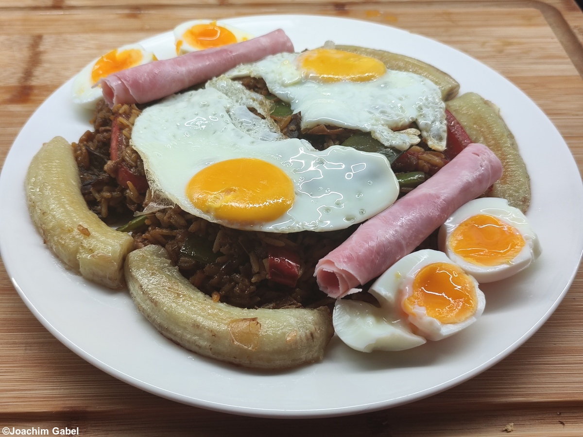 Dazu reicht man Bauchspeck oder Schinken, Spiegeleier und gebratene Bananen.