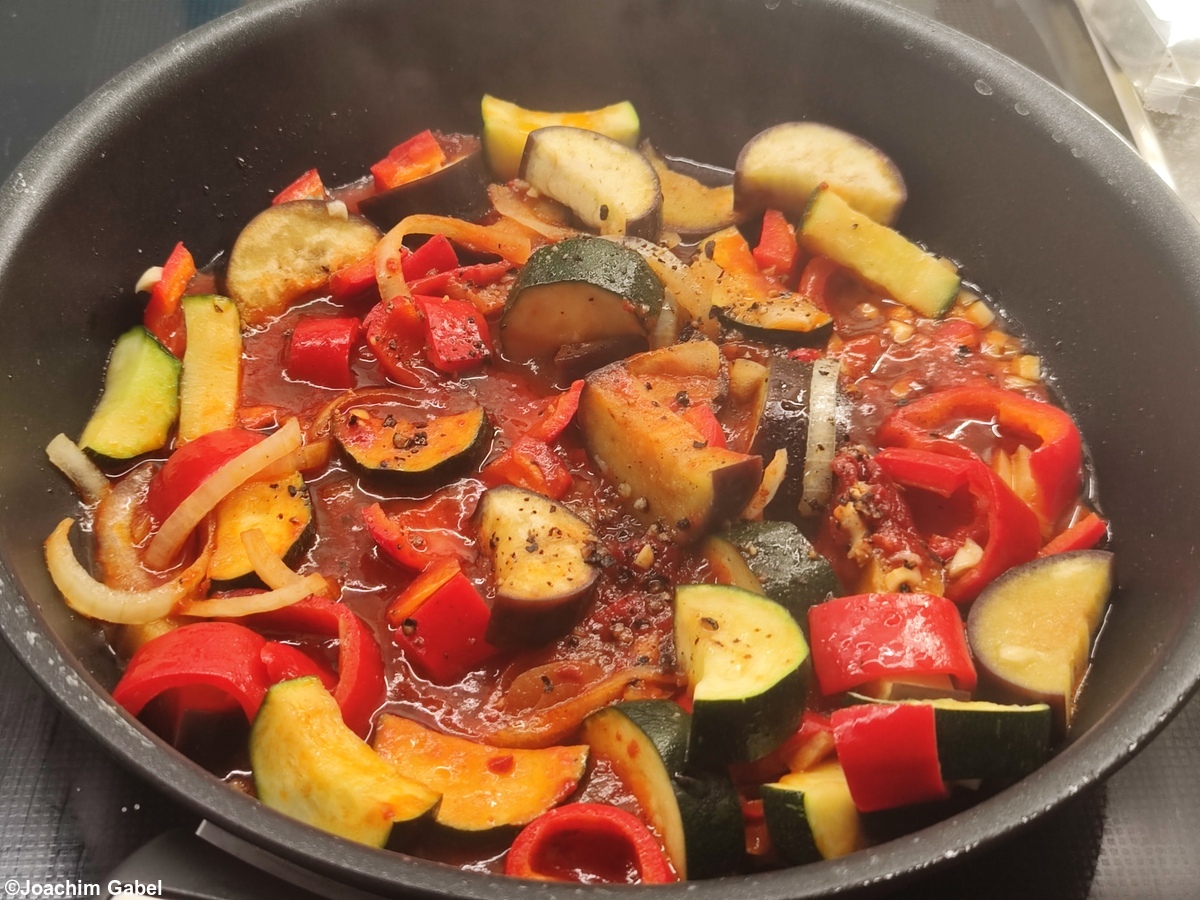 Ratatouille ist ein Gemüseeintopf aus der provenzalischen Küche, speziell von Nizza. Es gibt dafür ein für die Haute cuisine bindendes Rezept, das ich aber für meinen persönlichen Geschmack etwas geändert habe. Die klassischen Zutaten Aubergine, Paprika, Zucchini und Tomaten habe ich beibehalten, ebenfalls Zwiebel und Knoblauch. Was bei mir rausgefallen ist, sind die Kräuter der Provence, die ich durch frische Rosmarinzweige ersetzt habe. Um dem ganzen etwas mehr Flüssigkeit zu geben, kam außerdem noch eine Dose mit gehackten Tomaten dazu.