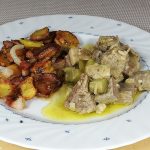 Simmer beef cubes in boiling salted water for one hour. Drain and mix with all other ingredients and simmer for another hour. Finally, put the lid aside and reduce until there is only a little bit of sauce sticking to the meat. Season with salt.