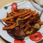 I got the recipe from the cookbook Indonesian Kitchen by Sri Owen. The first edition of the book in English dates from 1976, the German translation is from 1979. If you remember the old cooking habits from back then, you will understand that I have adapted the recipe greatly to today’s times. Back then, a lot of dry spices were still used such as ginger powder, chili powder and galangal powder, all of which I changed to fresh ingredients. Kaffir lime leaves are also available fresh in well-stocked Asian stores, but I would have to drive to Ludwigsburg to get them. I can easily save the gas for the 15 km with dried leaves.