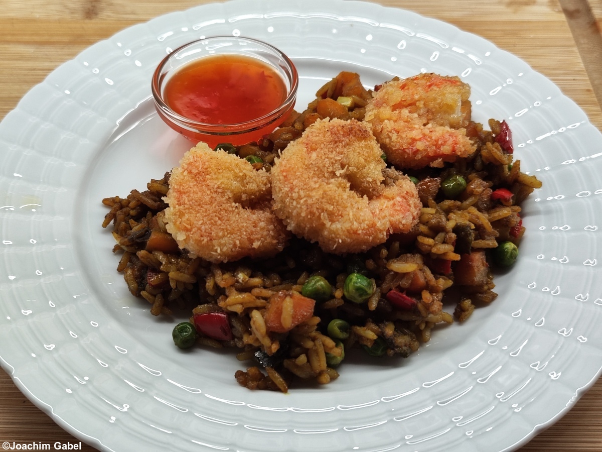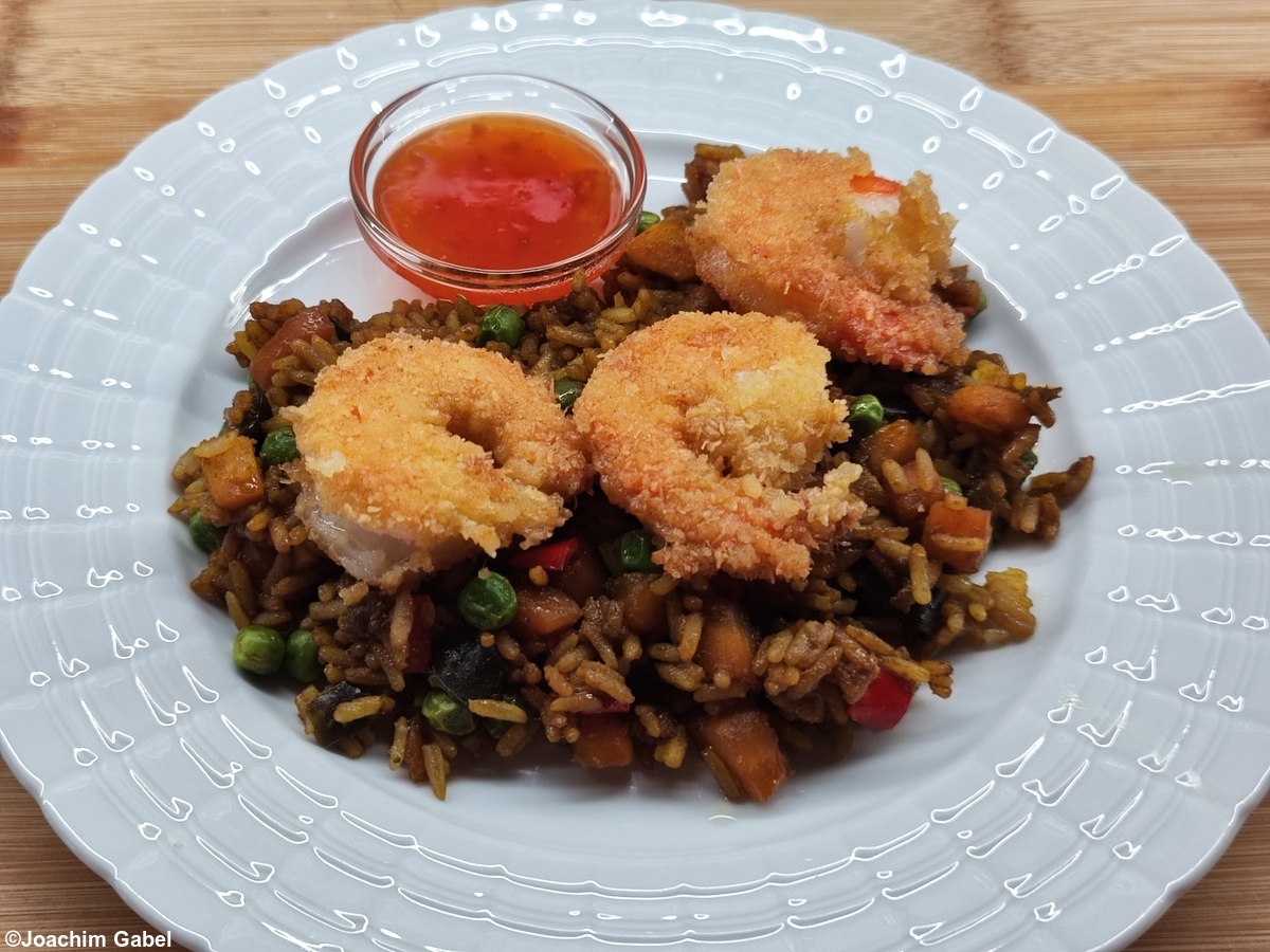 Für die Kokos Panko Garnelen gibt es unzählige Rezepte im Netz, also musste ich die auch mal probieren. Karibische Rezepte sind bei uns eher selten zu finden. Die Garnelen sind ja eher so eine Art Fingerfood, für eine vollständige Mahlzeit habe ich sie mit einem gemüselastigen Curryreis kombiniert. Der war dann aber eher aus der asiatischen Ecke.