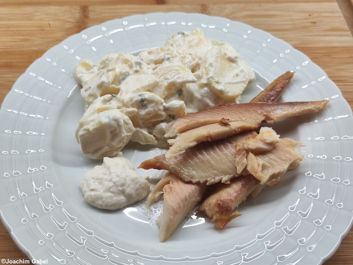 Falls der Fisch gekauft ist, bei 70° C im Backofen erwärmen und wie den frisch geräucherten behandeln. Damit schmeckt der Fisch wie frisch aus dem Räucherofen.