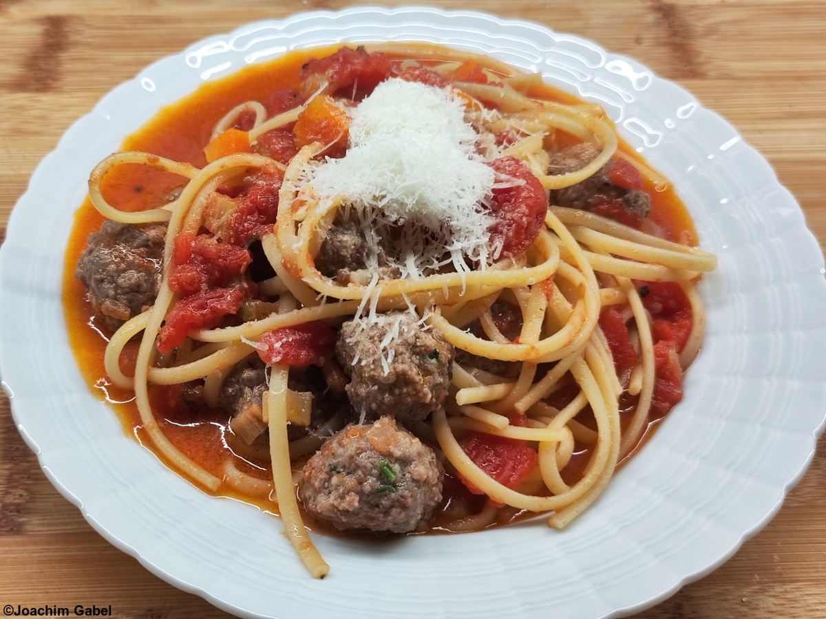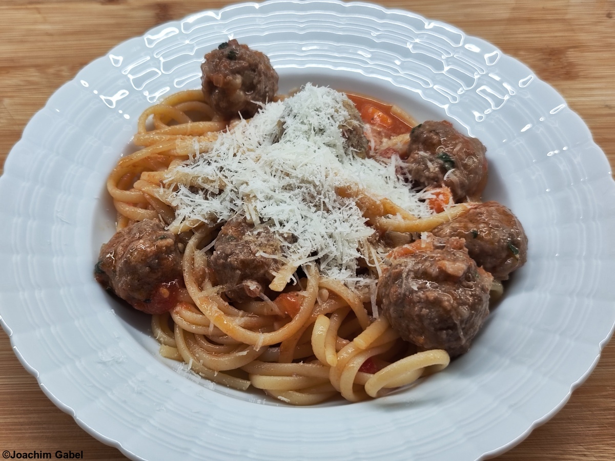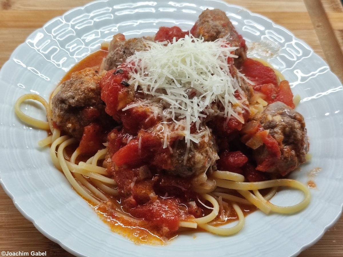 This shall be the original recipe from Mama Leone, which is also present in the cartoon Lady and the Tramp alleged. Some adjustments I have made anyway: The sour cream is hard to get here, I’ve replaced it with creme frâiche. The eternally long cooking with the cream was too risky for me, I have therefore only added the cream at the end. Also, the boiling down of the wine (like the meat broth) I have replaced with a much smaller amount added at the end.