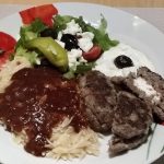 Das Gericht ist eine bunte Reise durch die Nachfolgestaaten von Jugoslawien, Griechenland und der Türkei. Ein Hauch Arabien ist mit dem Baba ghanoush auch noch dabei. Und ich habe das mal frech eine Frikadelle genannt. Frikadelle? In Deutschland macht man die garantiert nicht aus Lammfleisch und wenn die gefüllt ist, dann mit Emmentaler oder Gouda und bestimmt nicht mit bulgarischem Schafskäse. Das Grillgemüse war dann schon näher am Original vom Balkan. Egal, das hat einfach super geschmeckt und von daher ist es Wurscht, woher das kommt. Man kann als Ursprungsland auch meine Fantasie nennen.